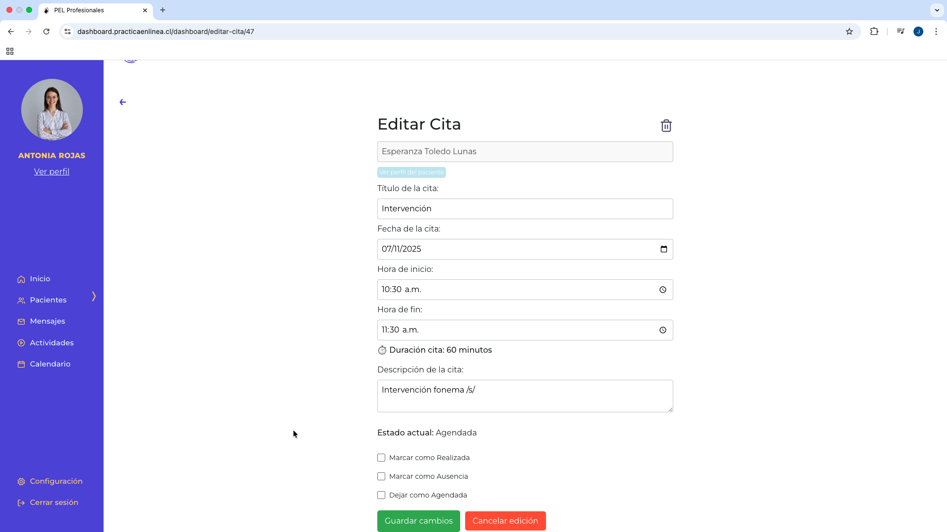 En Práctica en Línea puedes editar cualquier cita agendada para ajustar su horario, descripción o estado sin necesidad de eliminarla.