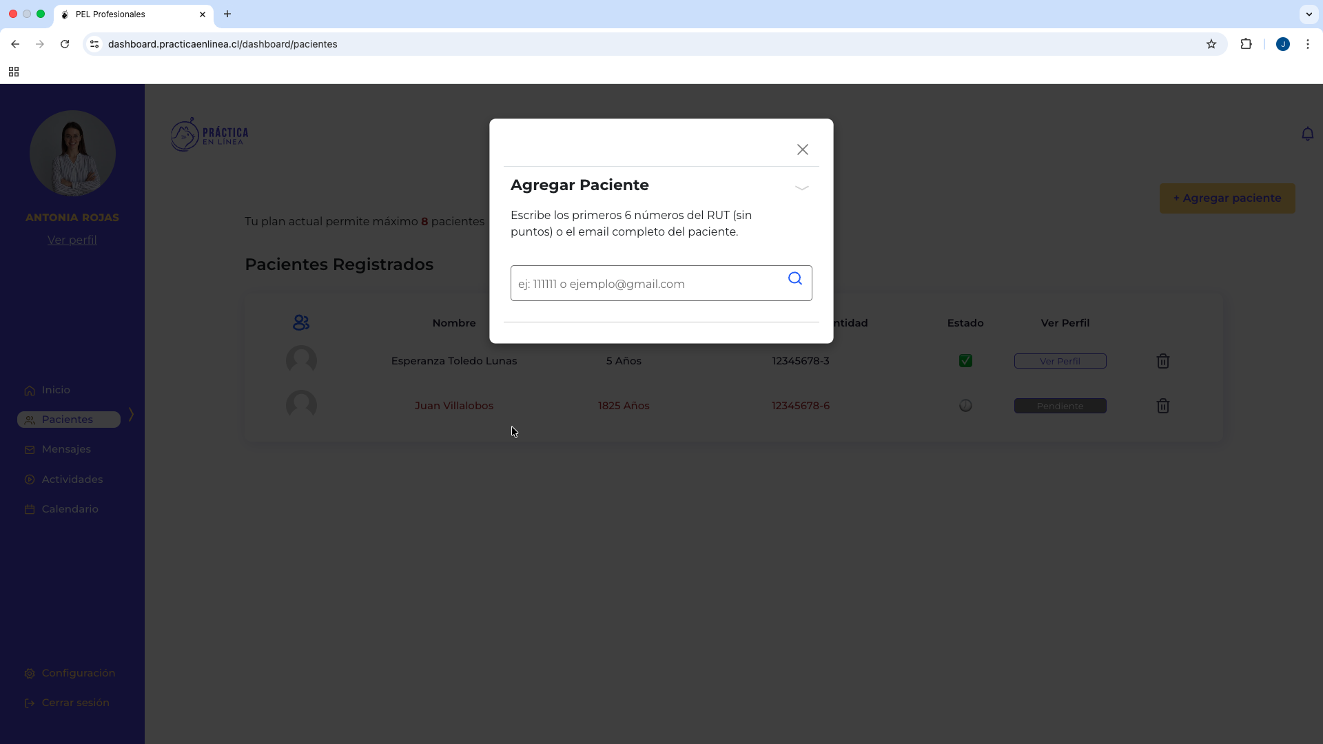 Al presionar “Agregar paciente”, se abrirá una ventana emergente.