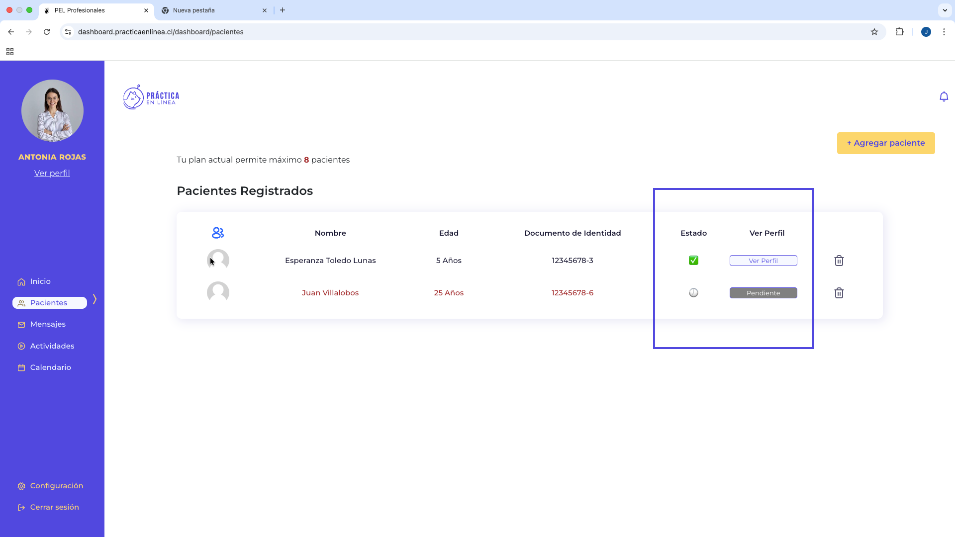 Una vez que el paciente confirme el vínculo, recibirás una notificación dentro de la plataforma web y su estado cambiará de “Pendiente” a “Activo”.