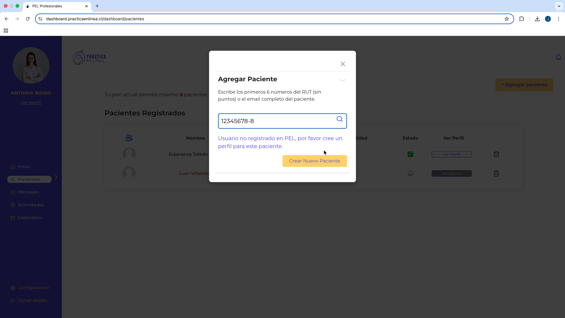 Si la persona no está registrada en la plataforma, verás el mensaje: Usuario no registrado en PEL. Por favor, cree un perfil para este paciente.